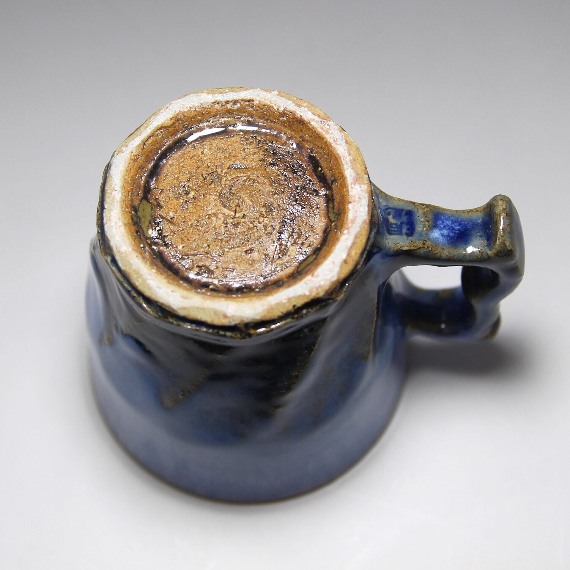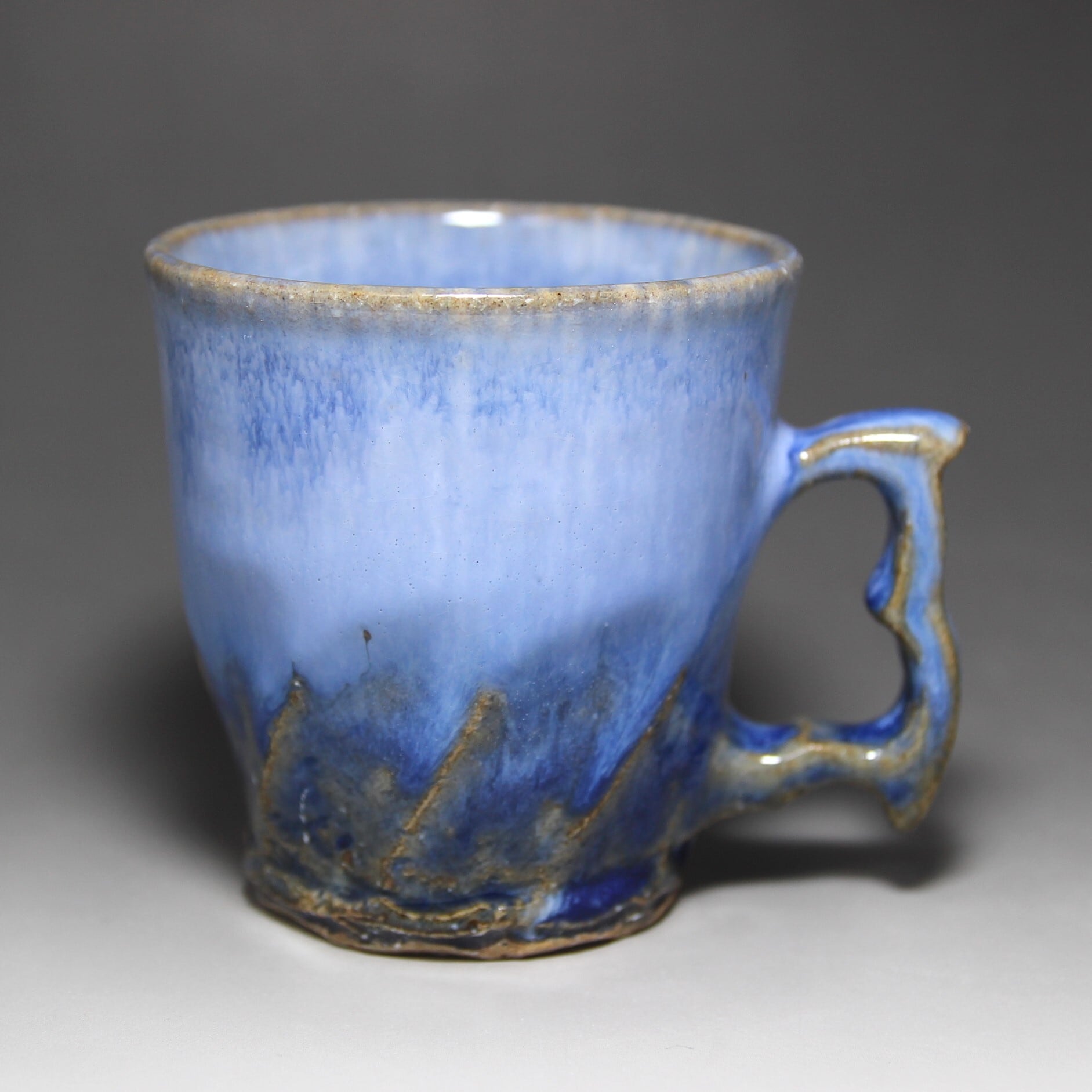 松雲山窯(松浦洞心 作) 縦9.0cm×横11.7cm×高さ9.5cm 紙箱包装 青みの強い釉薬が白と混ざりながら流れている爽やかな色のマグカップです。