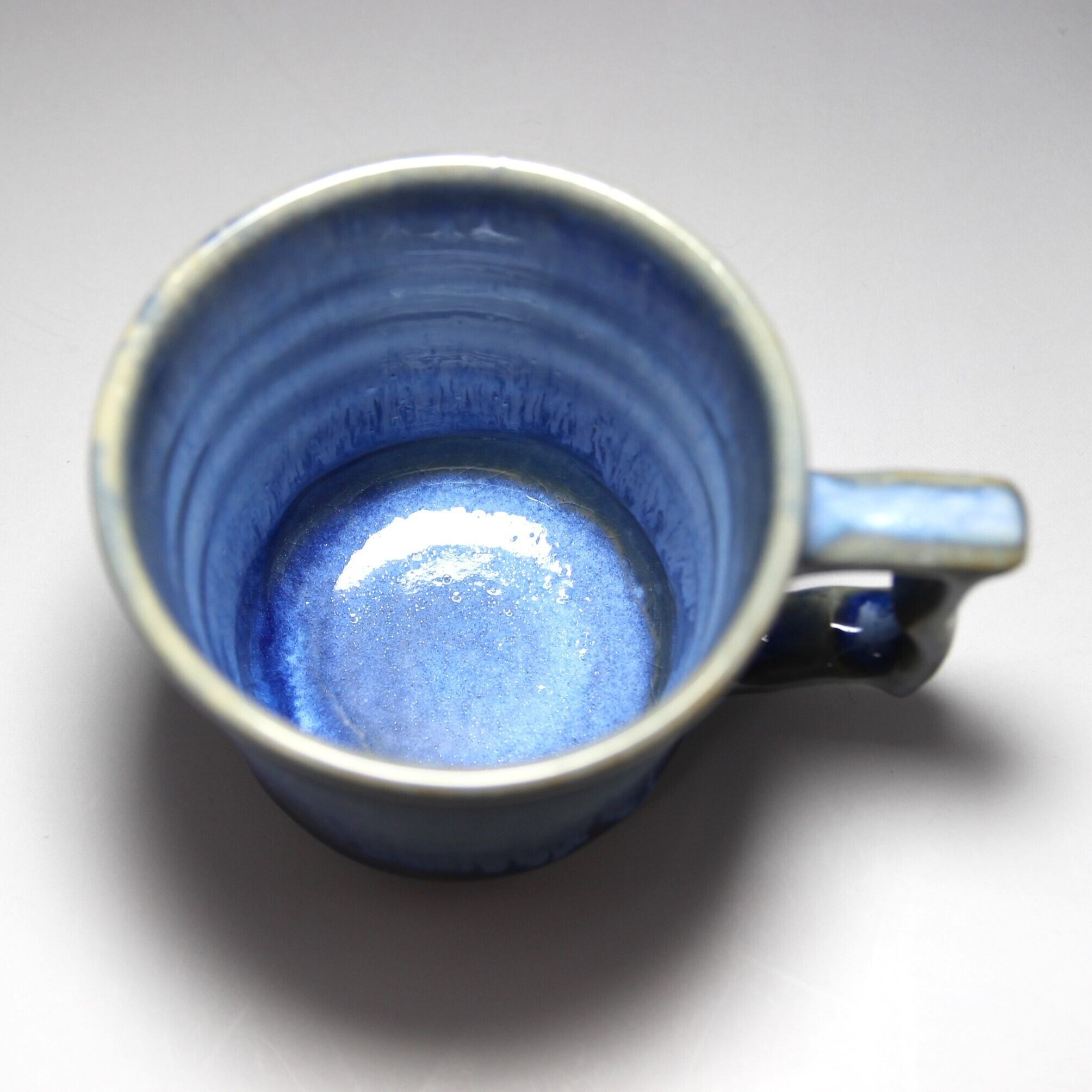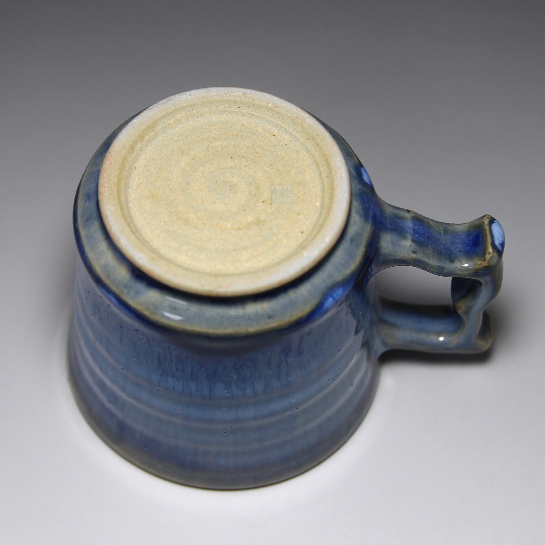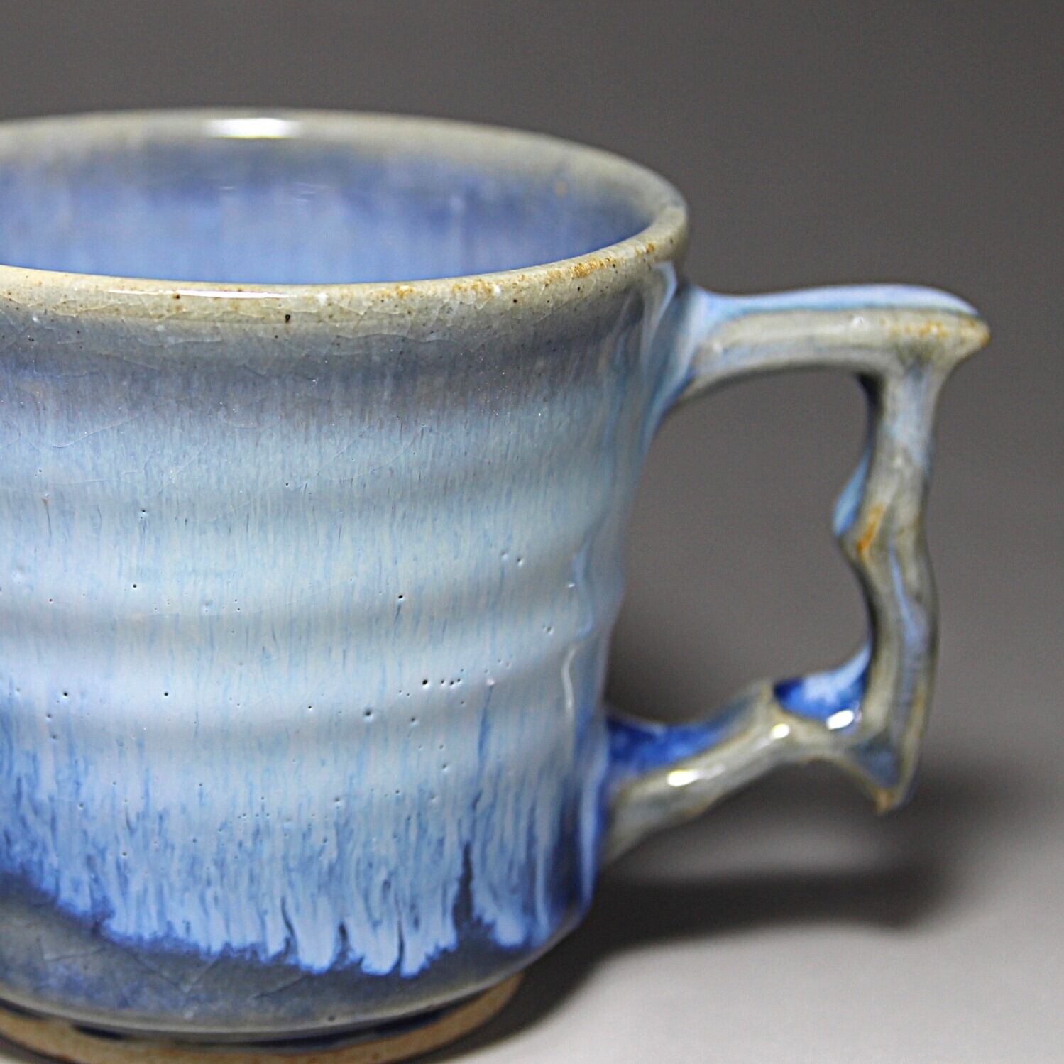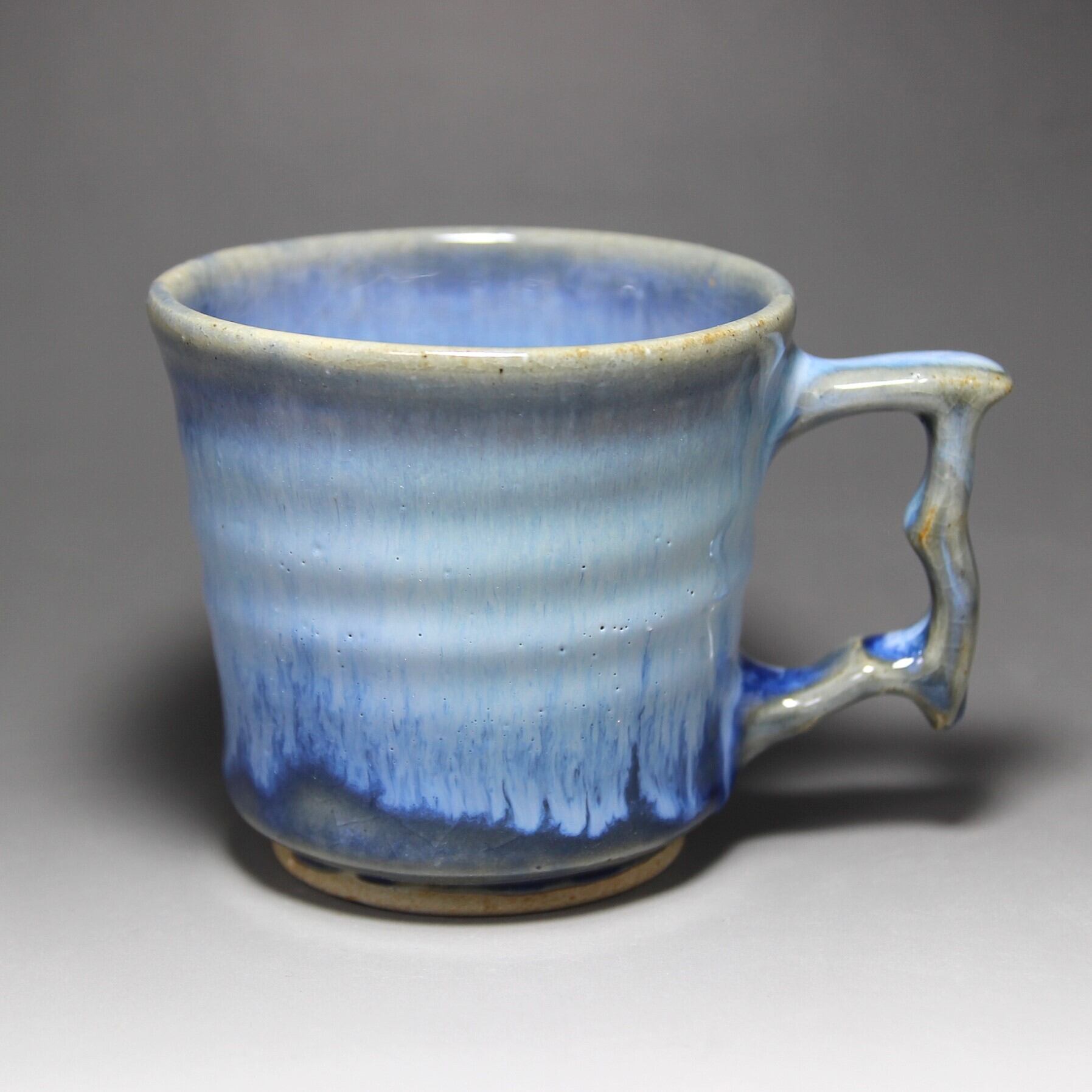 松雲山窯(松浦洞心 作) 縦9.6cm×横13.0cm×高さ9.2cm 紙箱包装 青白の釉薬が流れ、裾が水の流れのような模様となった涼やかな色合いのマグカップです。