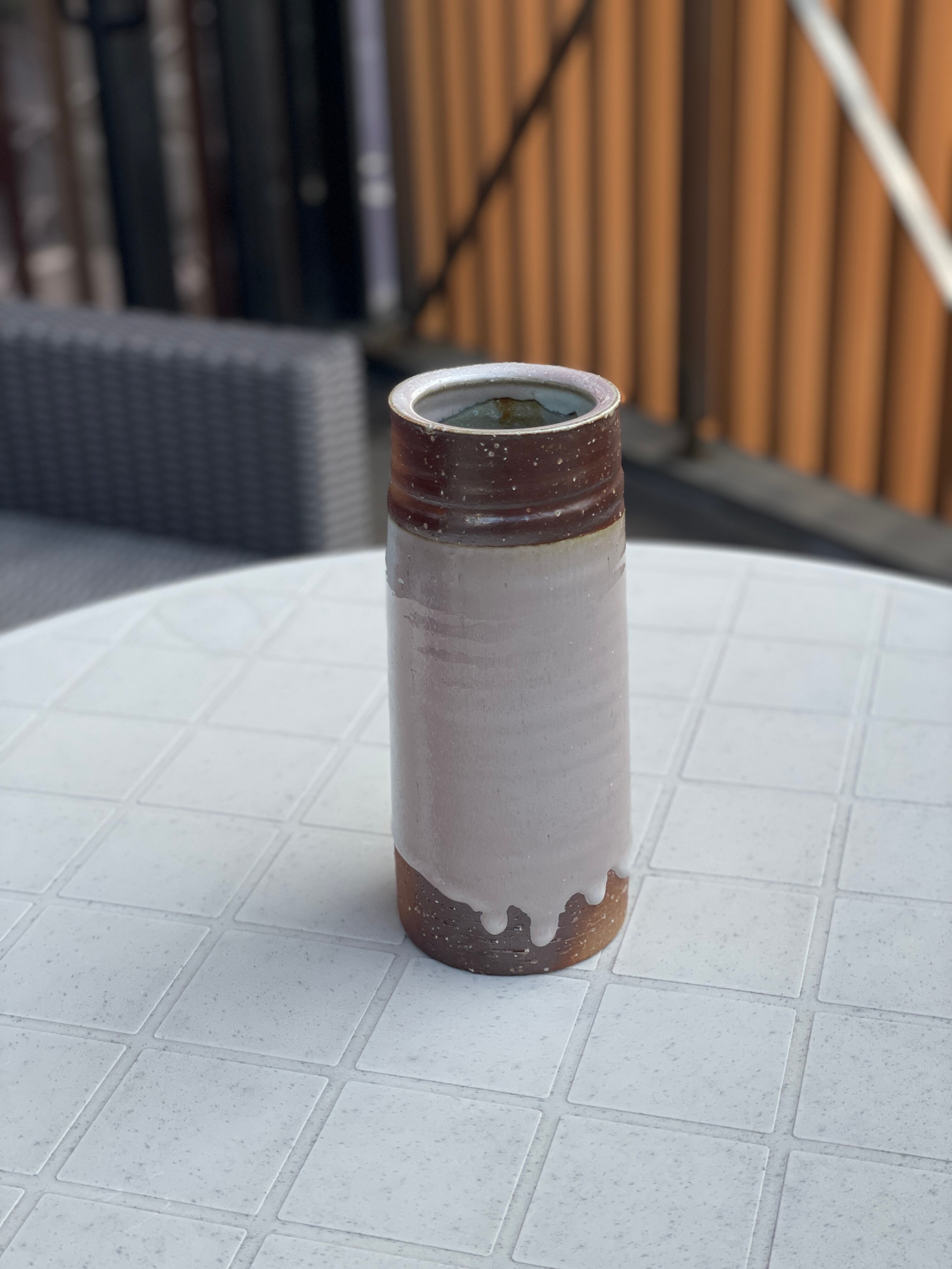 勝景庵 窯変花入れ サイズ:直径9.5cm × 高さ25cm 萩焼ならではの重厚感と温かみを感じられる花器です。 窯変による独特の色合いが美しく、置くだけでお部屋の雰囲気をやさしく和ませます。 ずっしりとした存在感があり、花を生けても、そのまま飾っても楽しめる逸品です。