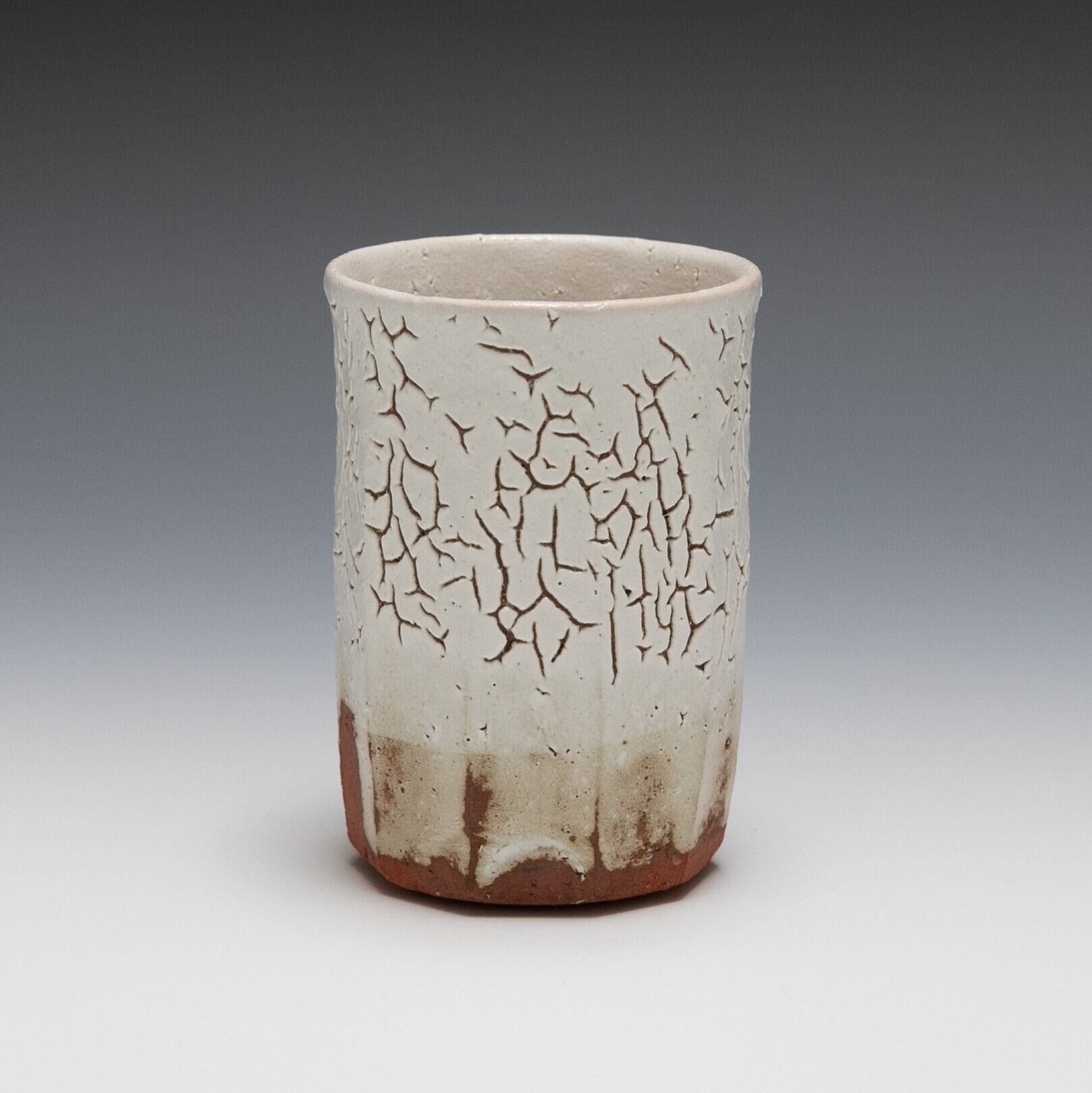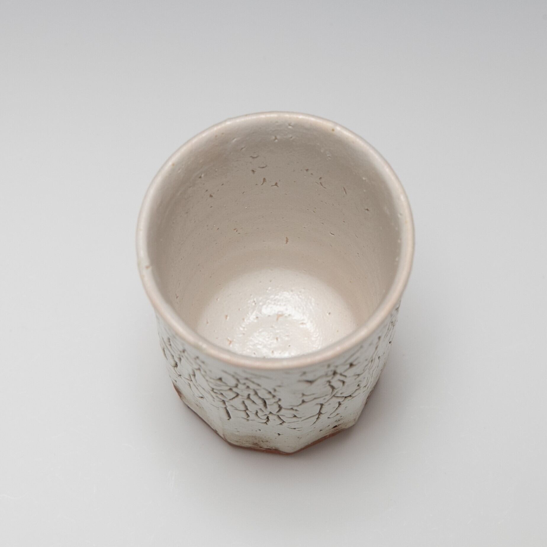 昭雲堂(椋原佳俊 作) 縦5.7㎝×横5.7㎝×高さ8.2㎝ 紙箱入 細かな白いかいらぎ釉の濃淡が美しい。面取りがスタイリッシュ。