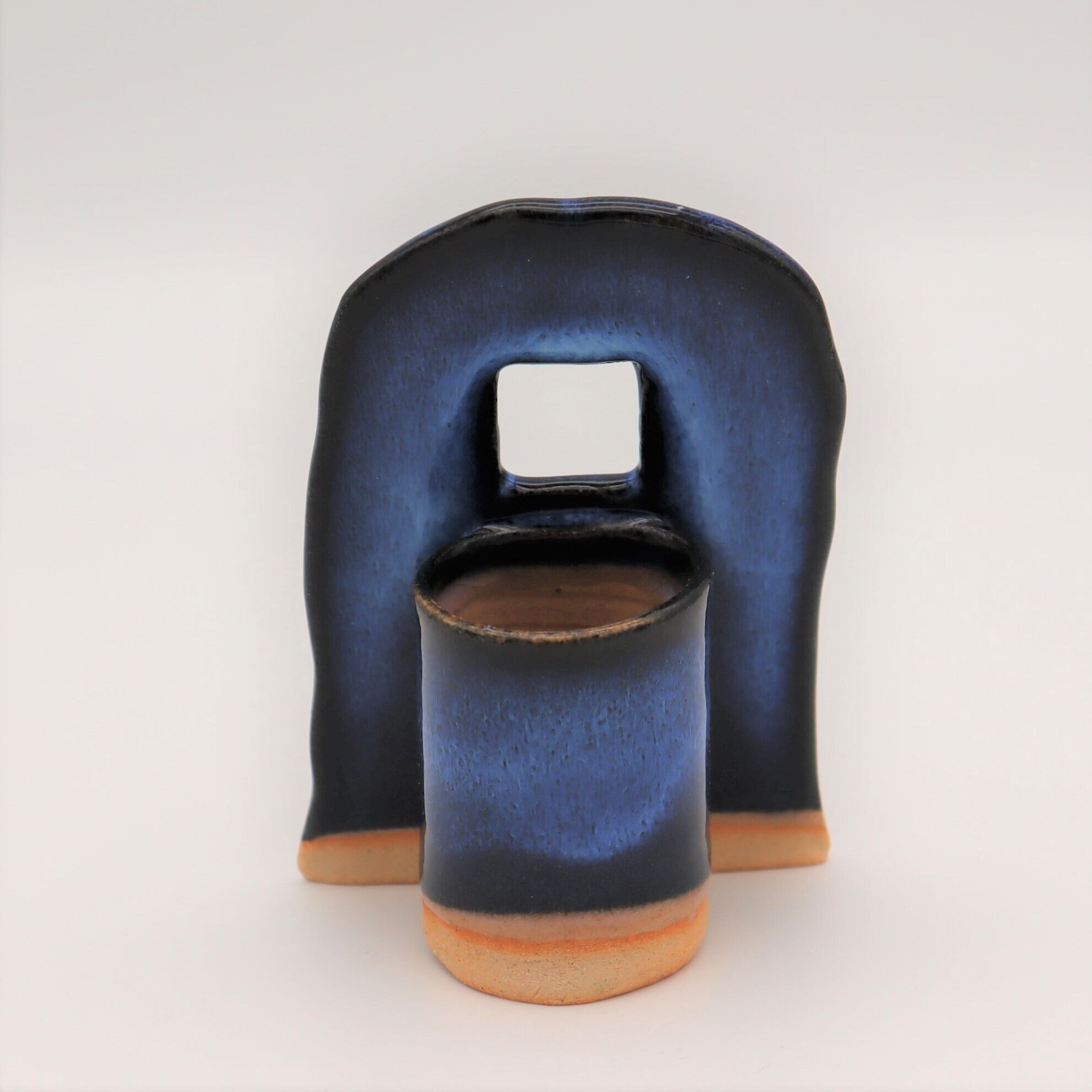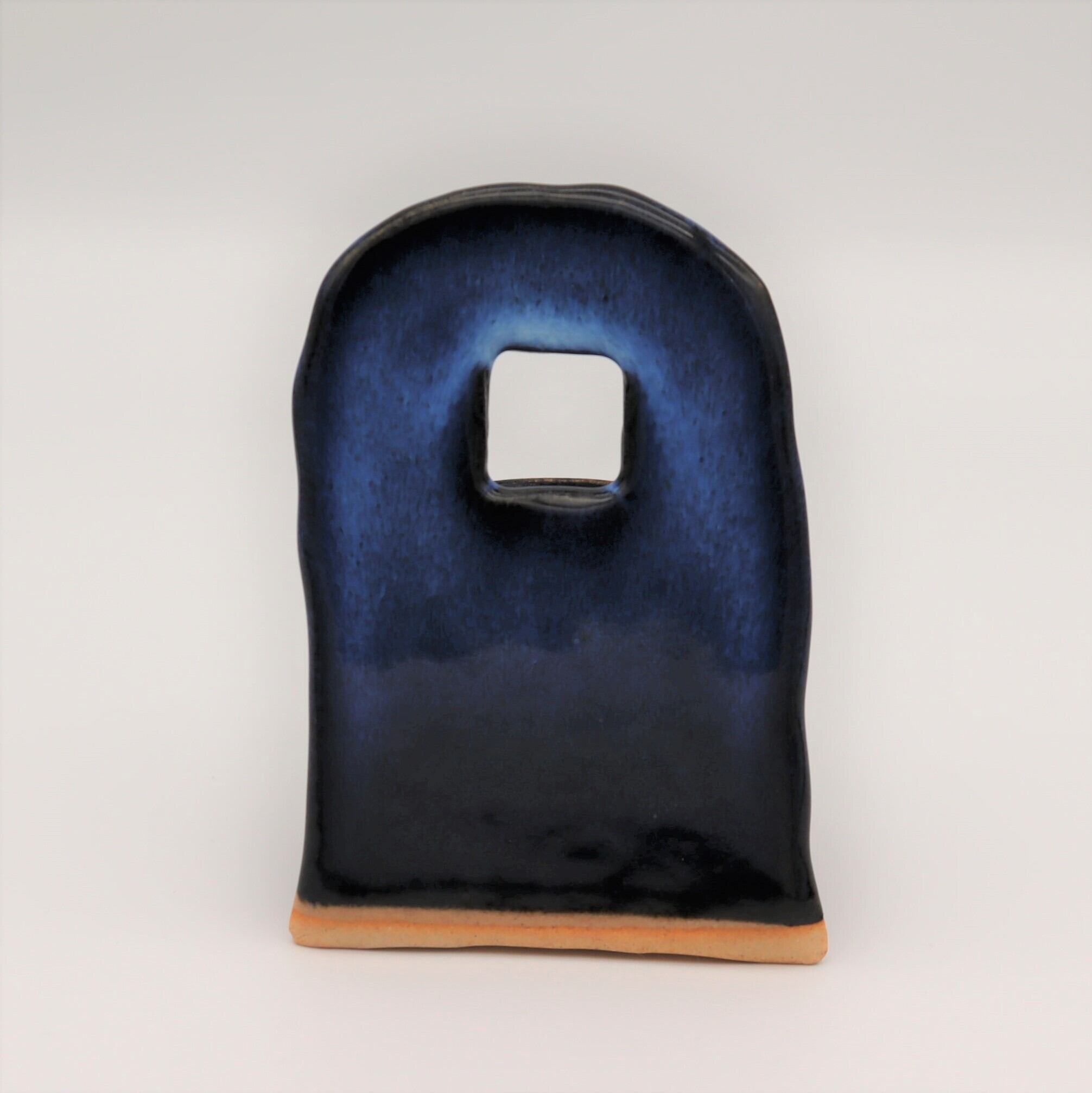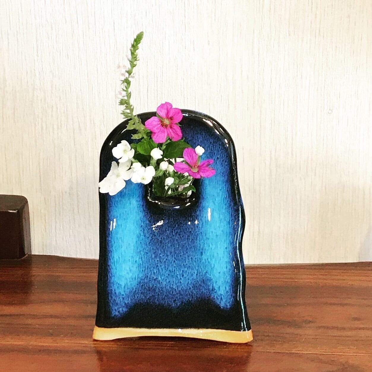 昭雲堂オリジナル 紙箱入り 窓花入YAMA:縦4.8㎝×横7.5㎝×高さ10.8cm 後ろに水受けがあり窓から小さな草花がひょいと顔を出す。素朴な草花を陶板の背景が引き立てる。深いブルーとうっすらと白い釉が流れて景色を創っている。