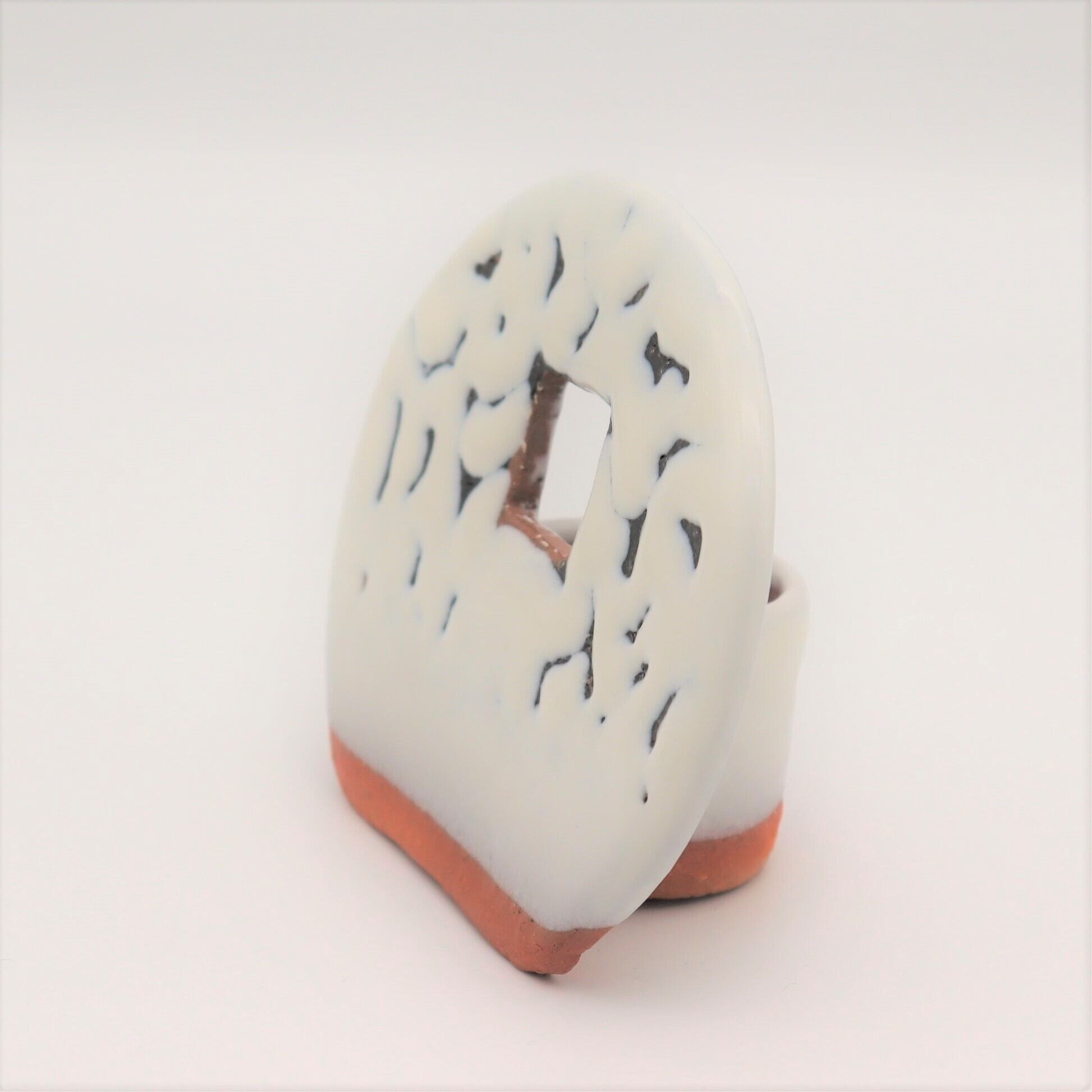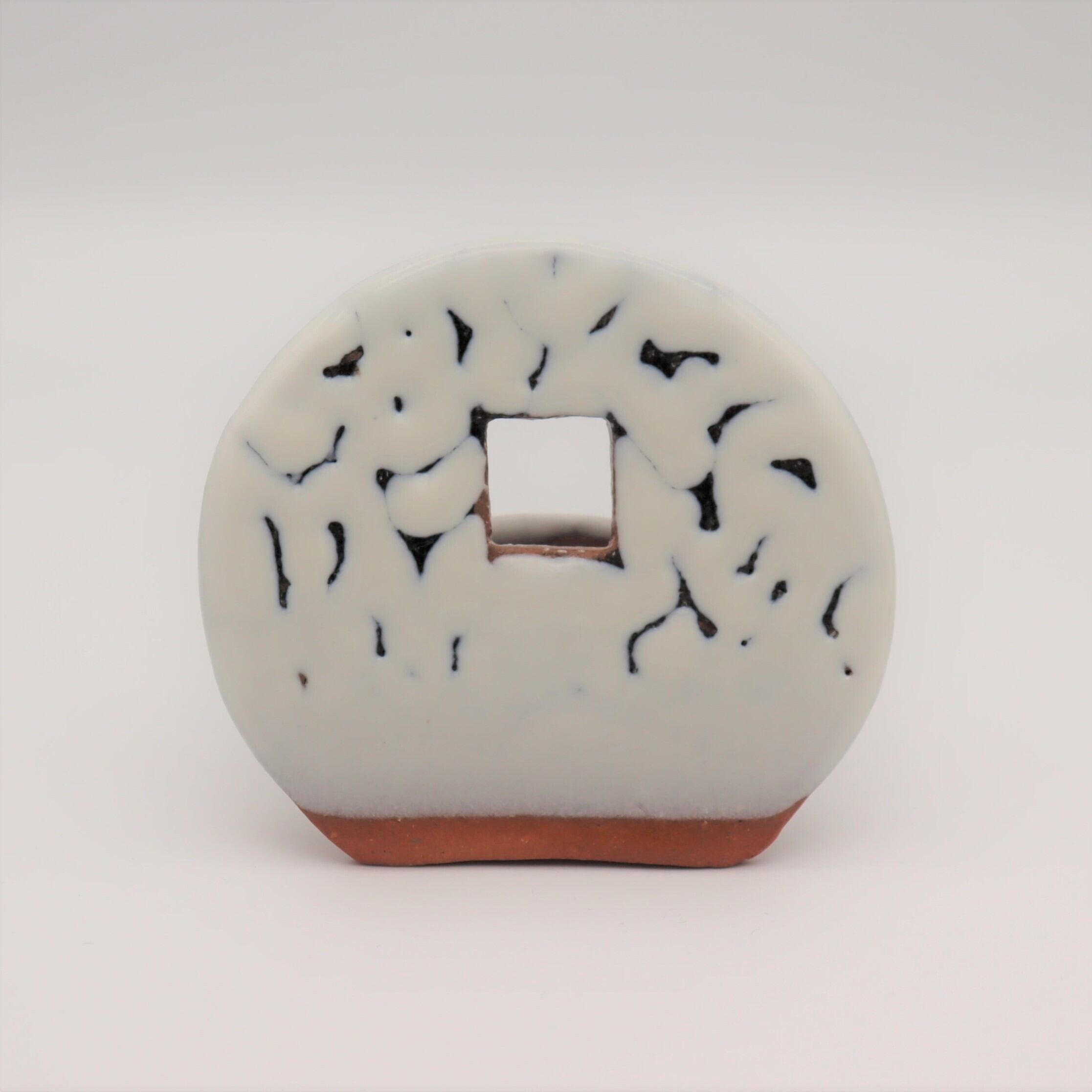 昭雲堂オリジナル 紙箱入り 窓花入MARU:縦5.0㎝×横11.0㎝×高さ9.5㎝ 後ろに水受けがあり窓から小さな草花がひょいと顔を出す。素朴な草花を陶板の背景が引き立てる。たっぷりとかかった白萩釉と下地の黒とのコントラストが美しい。