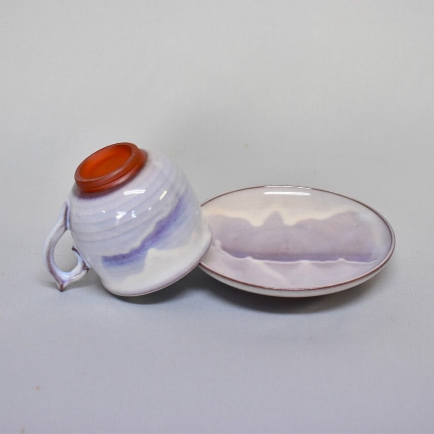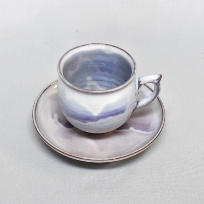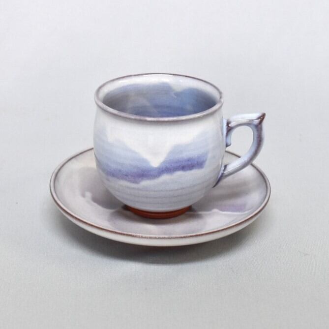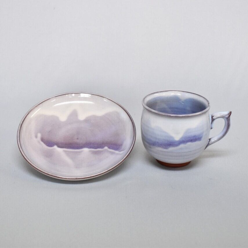 萩焼窯元 陶華山窯 当窯独自の萩むらさき釉です。美しい釉調で上品な造形のカップ&ソーサーです。 贈答用にも適しています。 カップ 径8.5㎝×高さ8㎝ ソーサー 径14.5㎝×高さ2.5㎝ 化粧箱入り